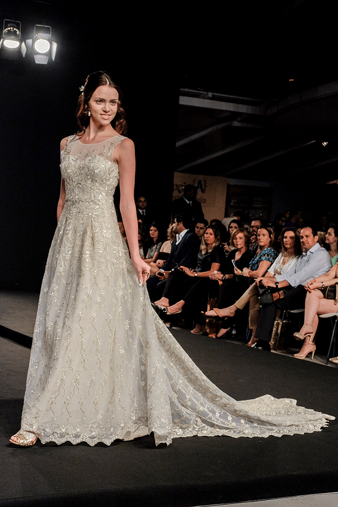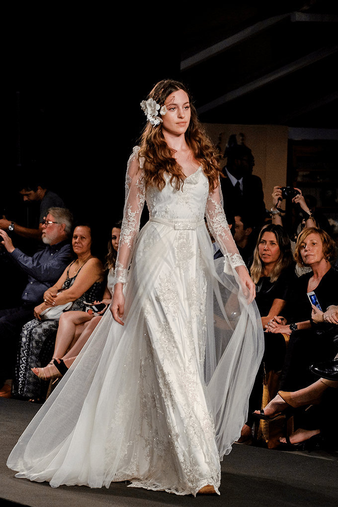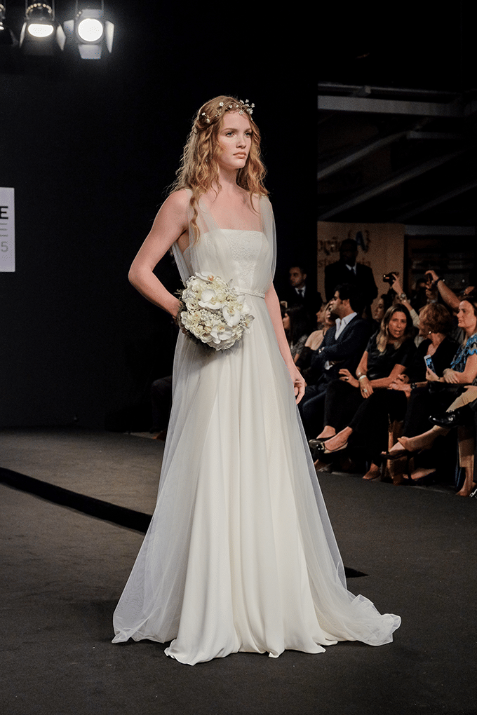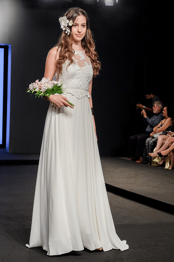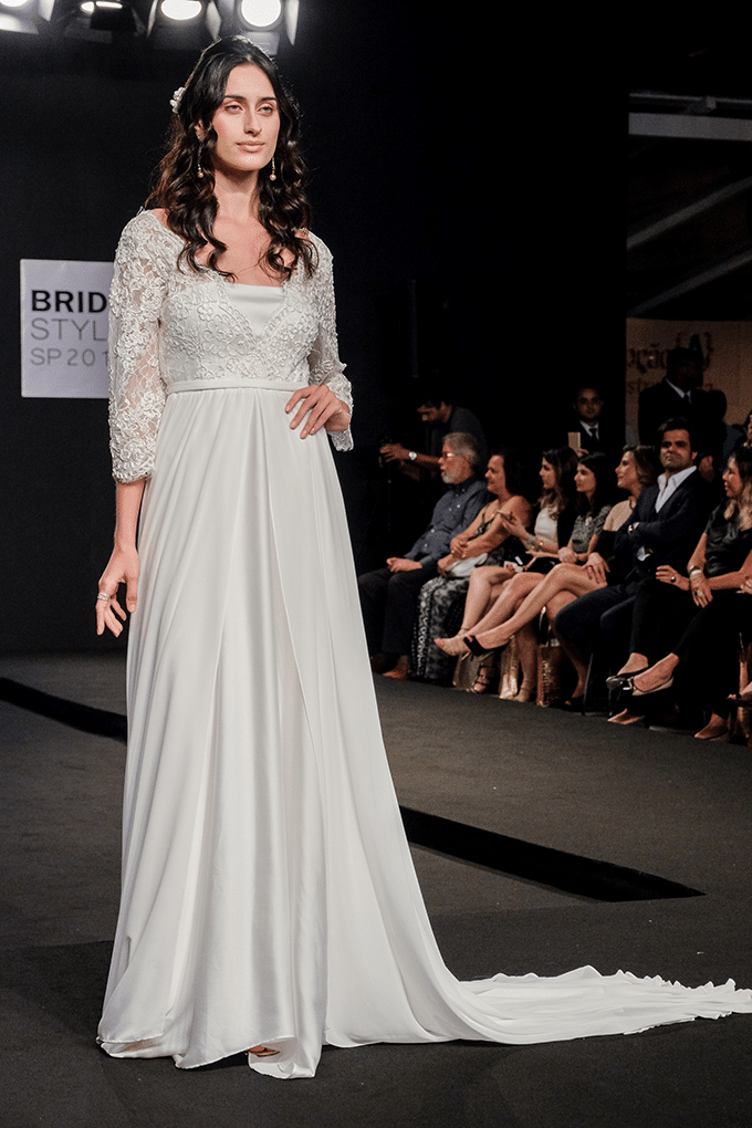 As rendas e texturas delicadas se combinam a tecidos fluidos, formando linhas leves e cinturas marcadas, focados para o casamento diurno, no campo e na praia.