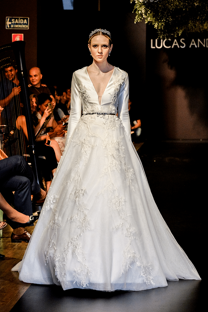 Letícia Birkheuer fechou o desfile, usando um modelo rendado de manga longa, sobreposto a uma cauda sereia em cetim liso, arrematado com um laço marcando a cintura.